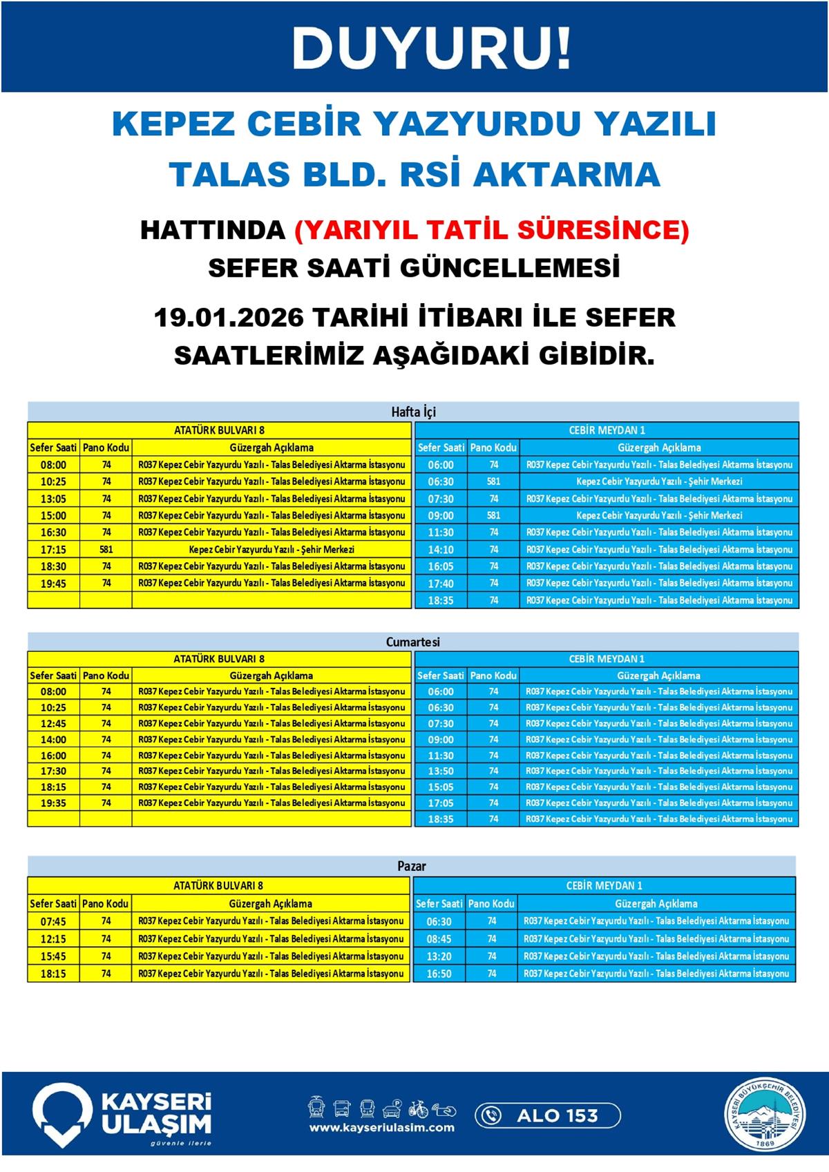 KEPEZ CEBİR YAZYURDU YAZILI TALAS BLD. RSİ AKTARMA HATTINDA (YARIYIL TATİL SÜRESİNCE) SEFER SAATİ GÜNCELLEMESİ