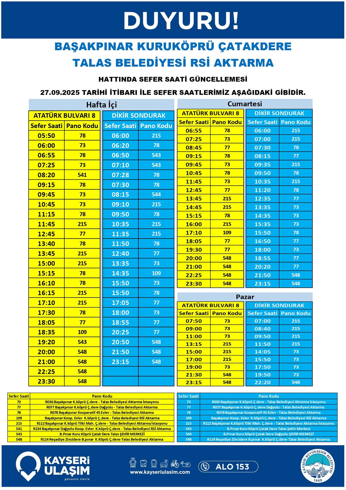 BAŞAKPINAR KURUKÖPRÜ ÇATAKDERE TALAS BELEDİYESİ RSİ AKTARMA HATTINDA SEFER SAATİ GÜNCELLEMESİ
