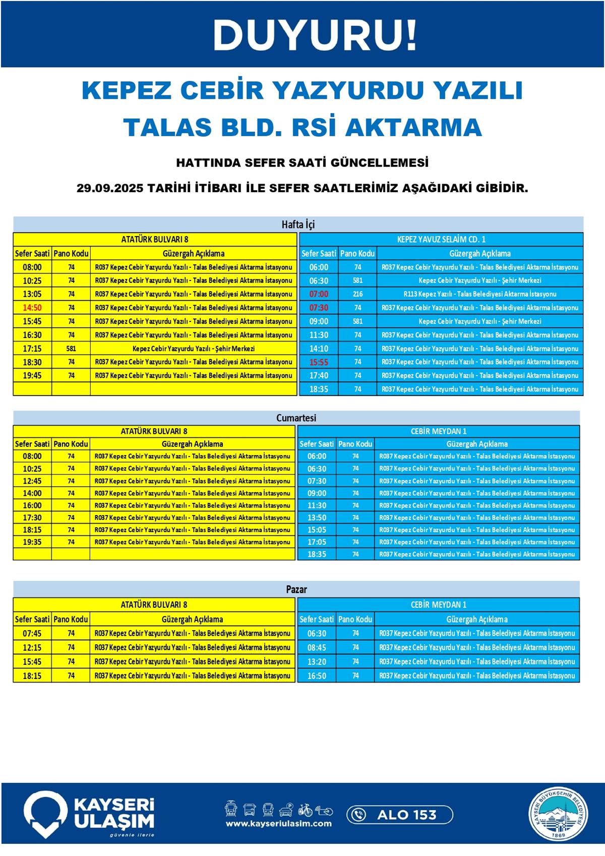 KEPEZ CEBİR YAZYURDU YAZILI TALAS BLD. RSİ AKTARMA HATTINDA SEFER SAATİ GÜNCELLEMESİ