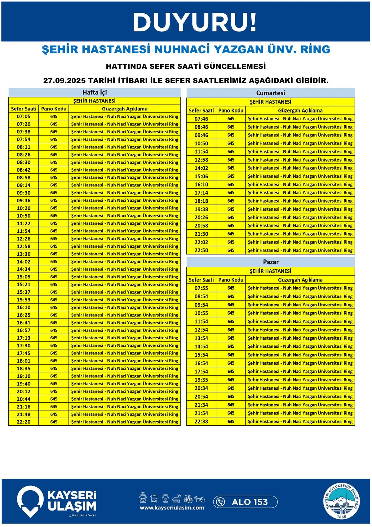 ŞEHİR HASTANESİ NUHNACİ YAZGAN ÜNV. RİNG HATTINDA SEFER SAATİ GÜNCELLEMESİ