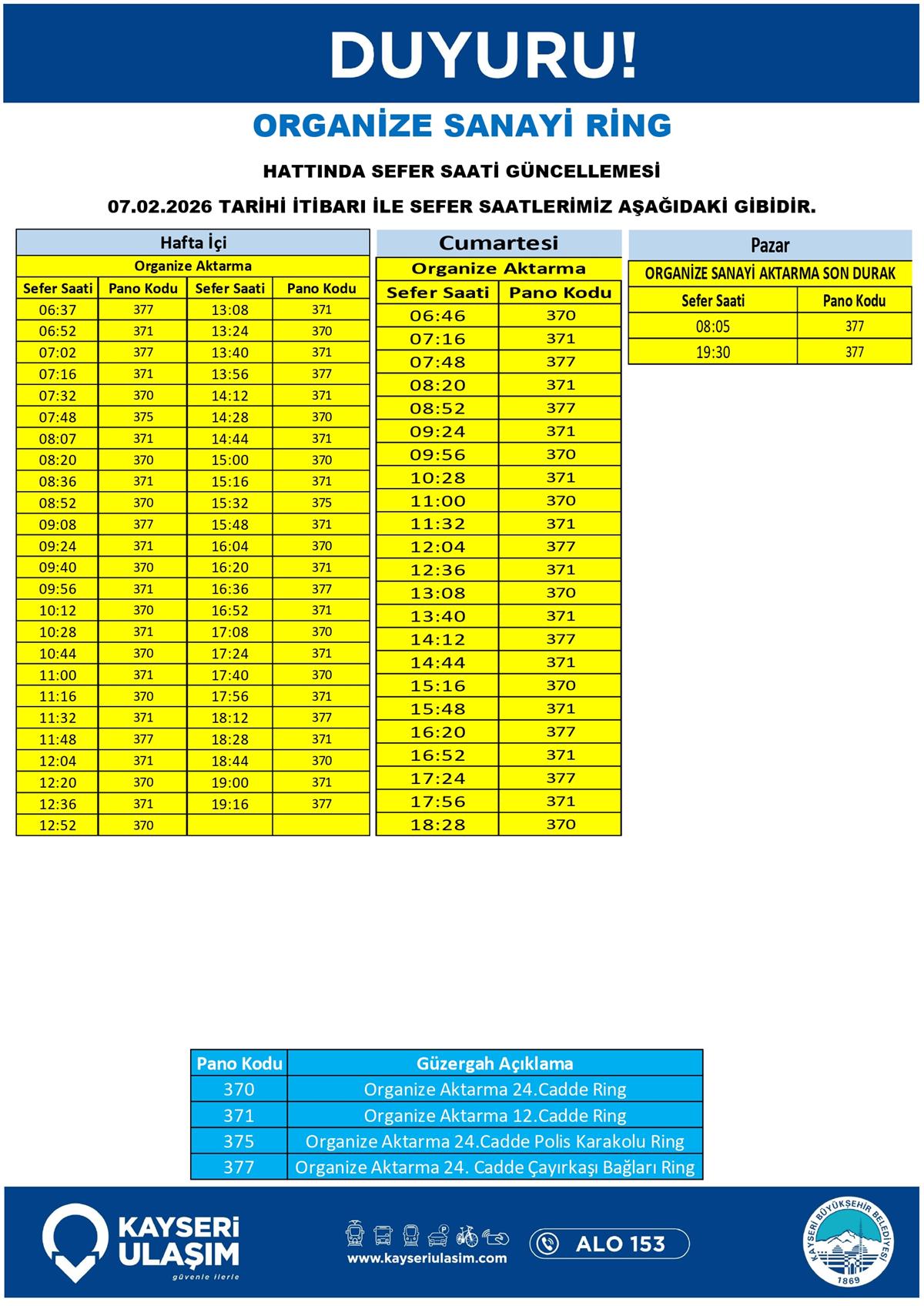 07 Şubat 2026 Tarihinden itibaren Organize Sanayi Ring hattında sefer saat güncellemesi...