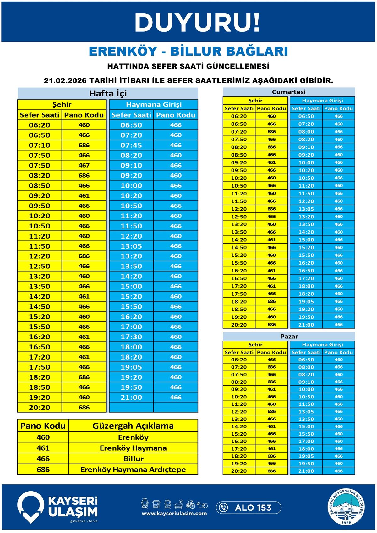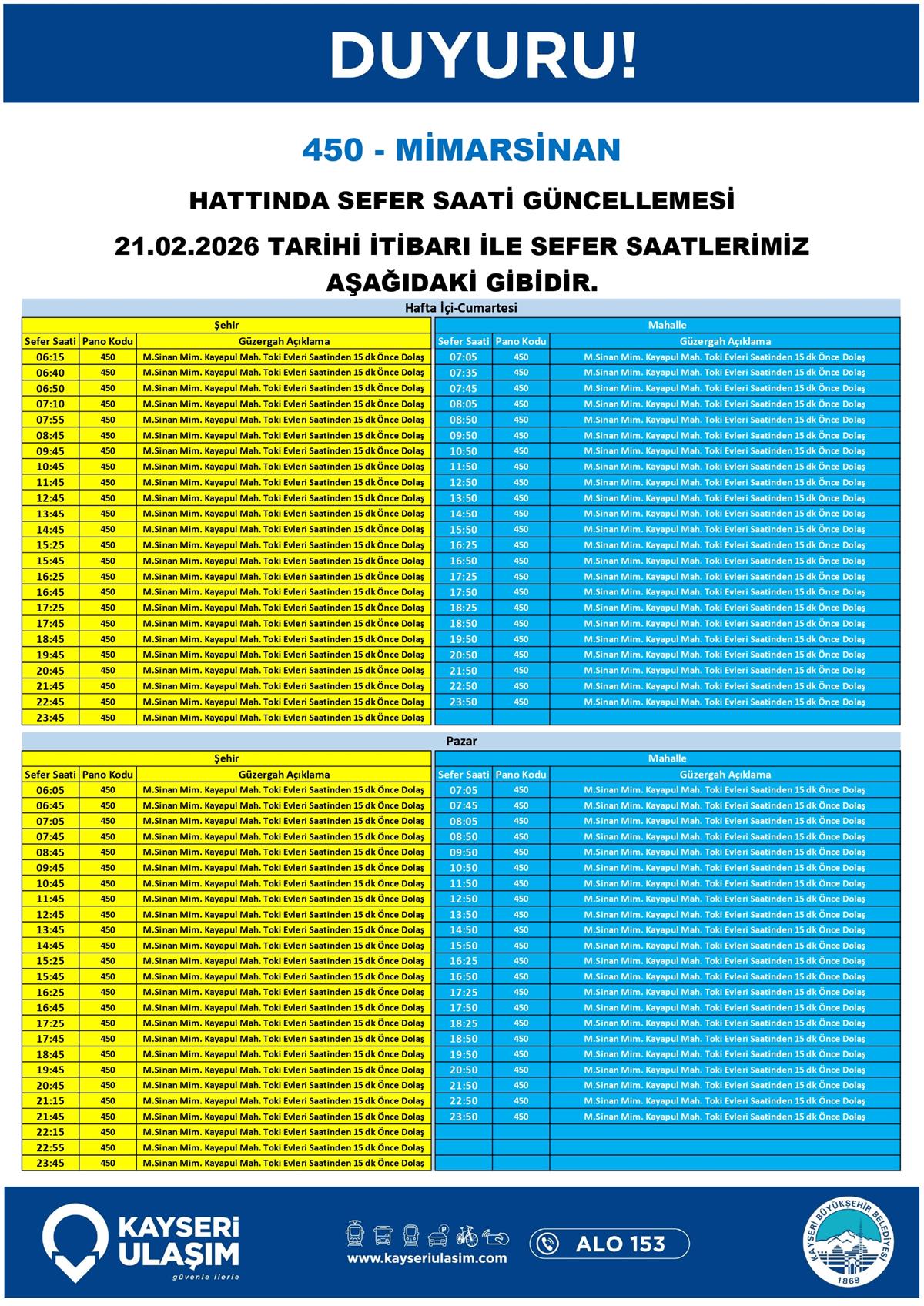 21 Şubat 2026 Tarihinden itibaren Bazı Sefer Saat Güncellemeleri Yapılmıştır.