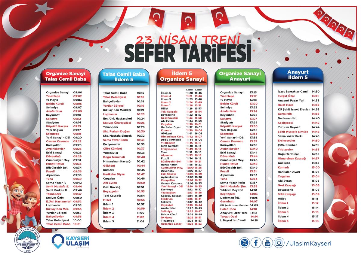 23 Nisan Ulusal Egemenlik ve Çocuk Bayramı dolayısıyla hazırladığımız 23 Nisan Tramvayı'nın sefer tarifeleri aşağıdaki gibidir.