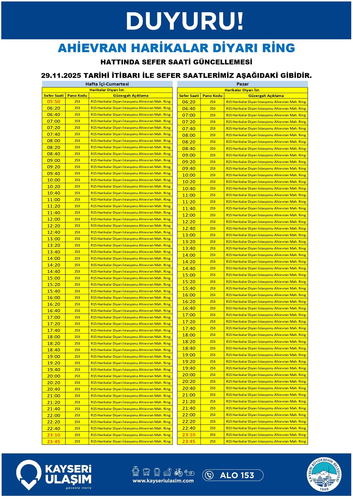 AHİEVRAN HARİKALAR DİYARI RİNG HATTINDA SEFER SAATİ GÜNCELLEMESİ