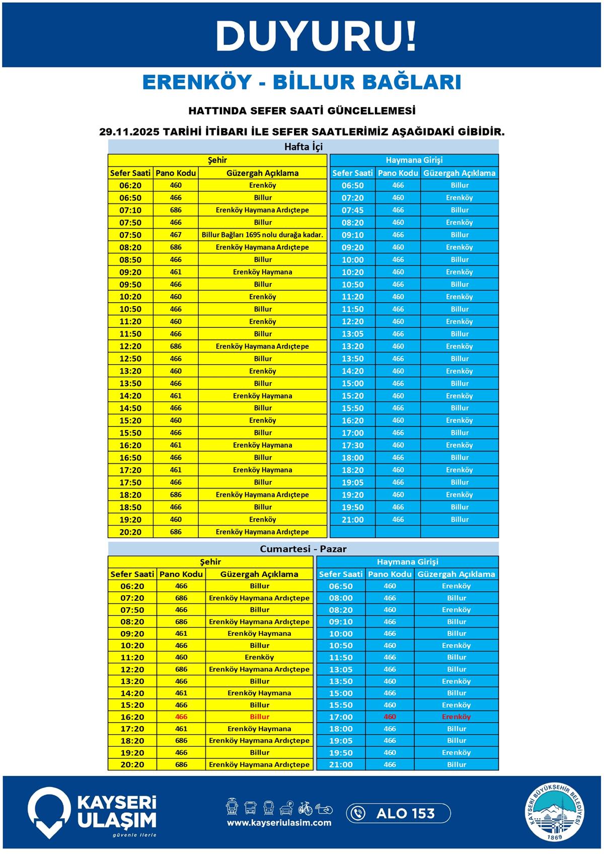 29 Kasım 2025 Tarihinden itibaren Bazı Sefer Saat Güncellemeleri Yapılmıştır.