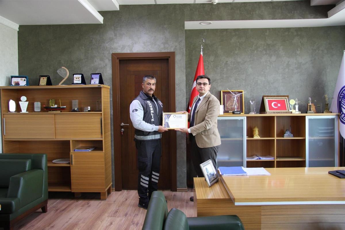 Bu örnek davranışından dolayı Ulaşım A.Ş. Genel Müdürü Mehmet Canbulut, güvenlik personelimiz Ayhan Akış’a teşekkür belgesi ve hediyesini takdim etti.